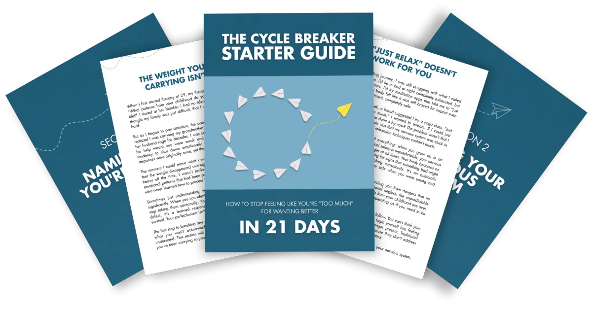 The old way is trying to "just relax" or forcing yourself to calm down and it doesn't work because your nervous system is stuck in survival mode from years of emotional chaos...